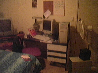 My work space is shown complete with coffee mug, fake leather jacket over chair, little white board which doesn't like to rub out, lamp, bear-shaped cd rack, 10-dollar keyboard, clients business card attached to monitor, 2.1 stereo for tunes, extra height via books and some dodgy PHP book which I was fooled into buying 😉... oh lets not forget the extra fan power which stops the machine from cooking its self :o