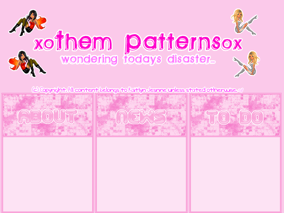 I am not entirely sure how I got this website name, I usually just choose some random objects that come to mind. This one was simple and flowing. xoThem Patternsox is my personal blog about myself. If you wish to contact me, my email address is <a href="mailto:fudgydoll@hotmail.com">fudgydoll@hotmail.com</a>, please no spam, everyone hates that stuff!!! You can view all my affiliates at the top, if you are not listed and you want to be, please get to know me first. I only affiliate with people I know or if I really like your website I will apply for yours. Thanks a lot, and remember to keep in touch. </div>